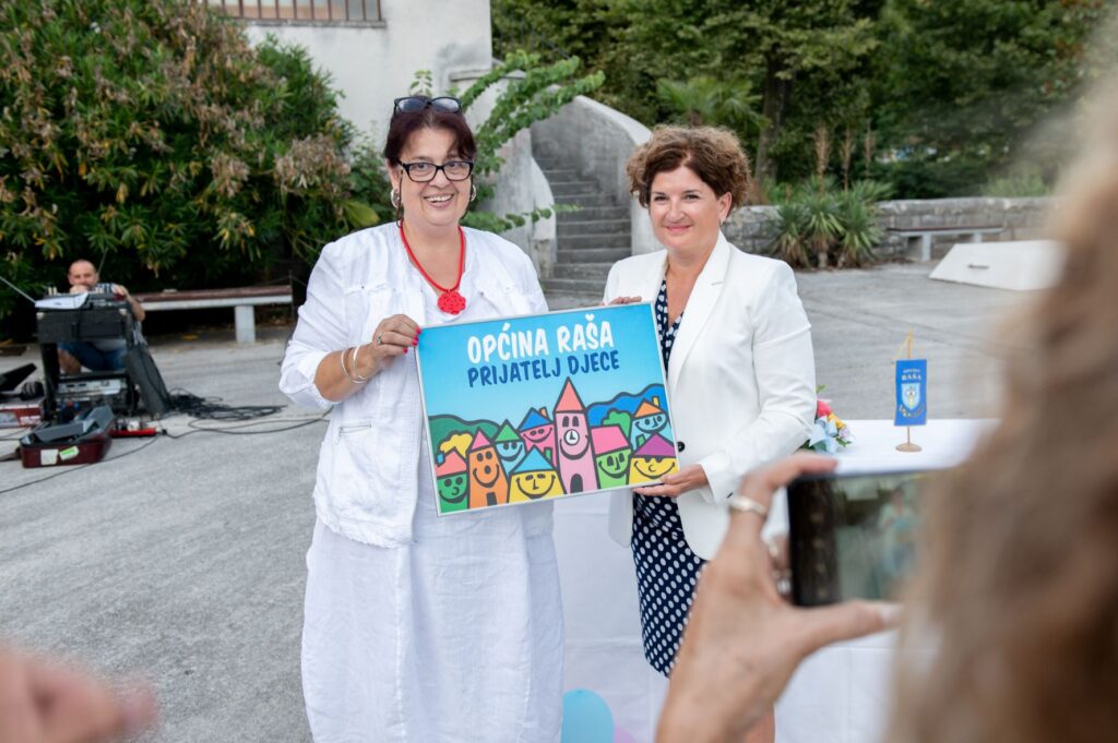 Velik dan za Općinu Raša: od jučer i službeno nosi prestižnu titulu Općina – prijatelj djece! Priznanje u obliku natpisne ploče sinoć je tijekom svečanosti na raškom trgu dopredsjednica Saveza Društava „Naša djeca“ Hrvatske Sanja Škorić uručila općinskoj načelnici Gloriji Paliska.